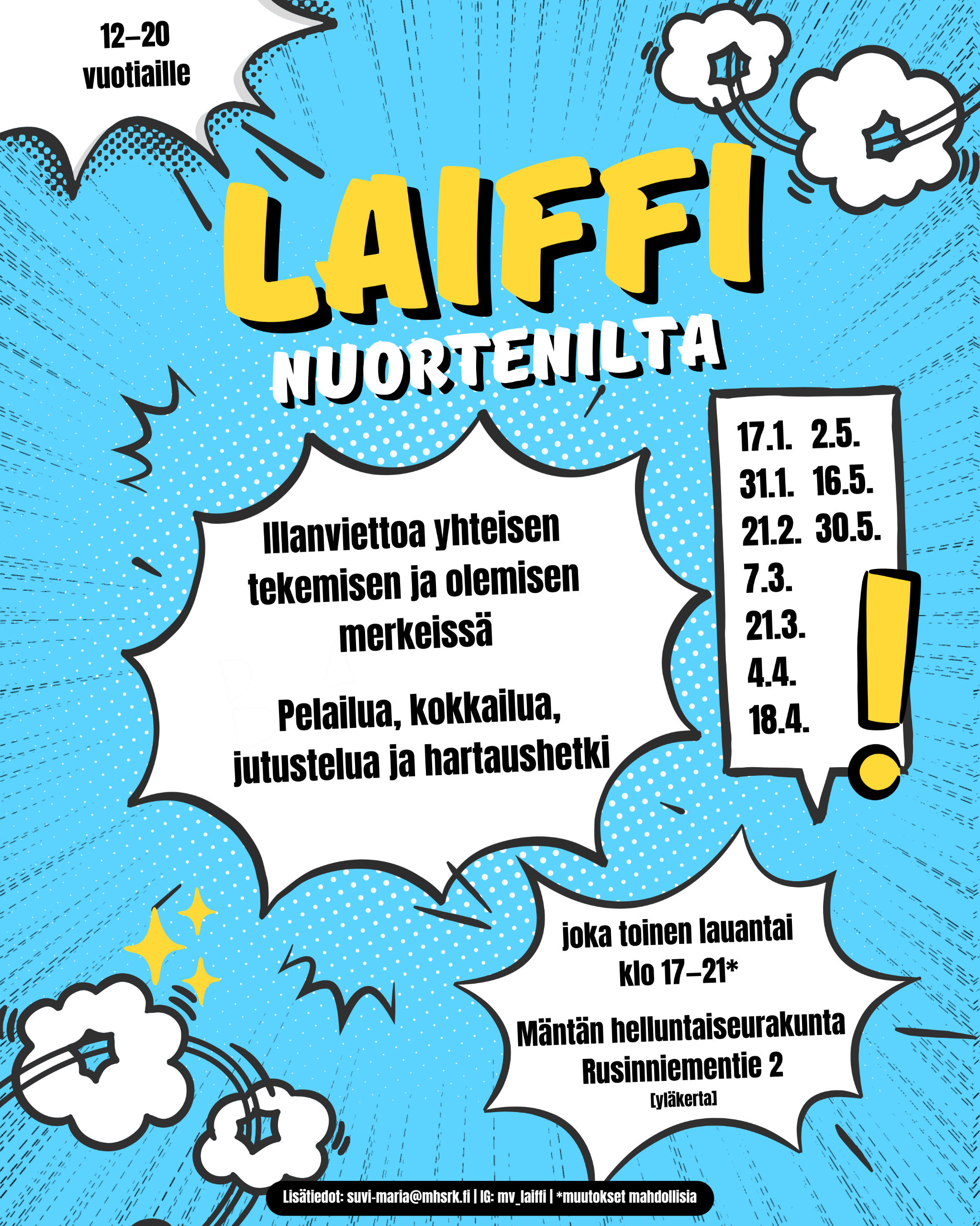 Laiffi nuortenillat keväällä 2026 24.1.2026 Mäntän Helluntaiseurakunta Ajankohtaista Illanviettoa yhteisen tekemisen ja olemisen merkeissä. Pelailua, kokkailua, jutustelua ja hartaushetki. Joka toinen lauantai klo 17-21: 17.1. 31.1. 21.2. 7.3. 21.3. 4.4. 18.4. 2.5. 16.5. 30.5. Tervetuloa mukaan!