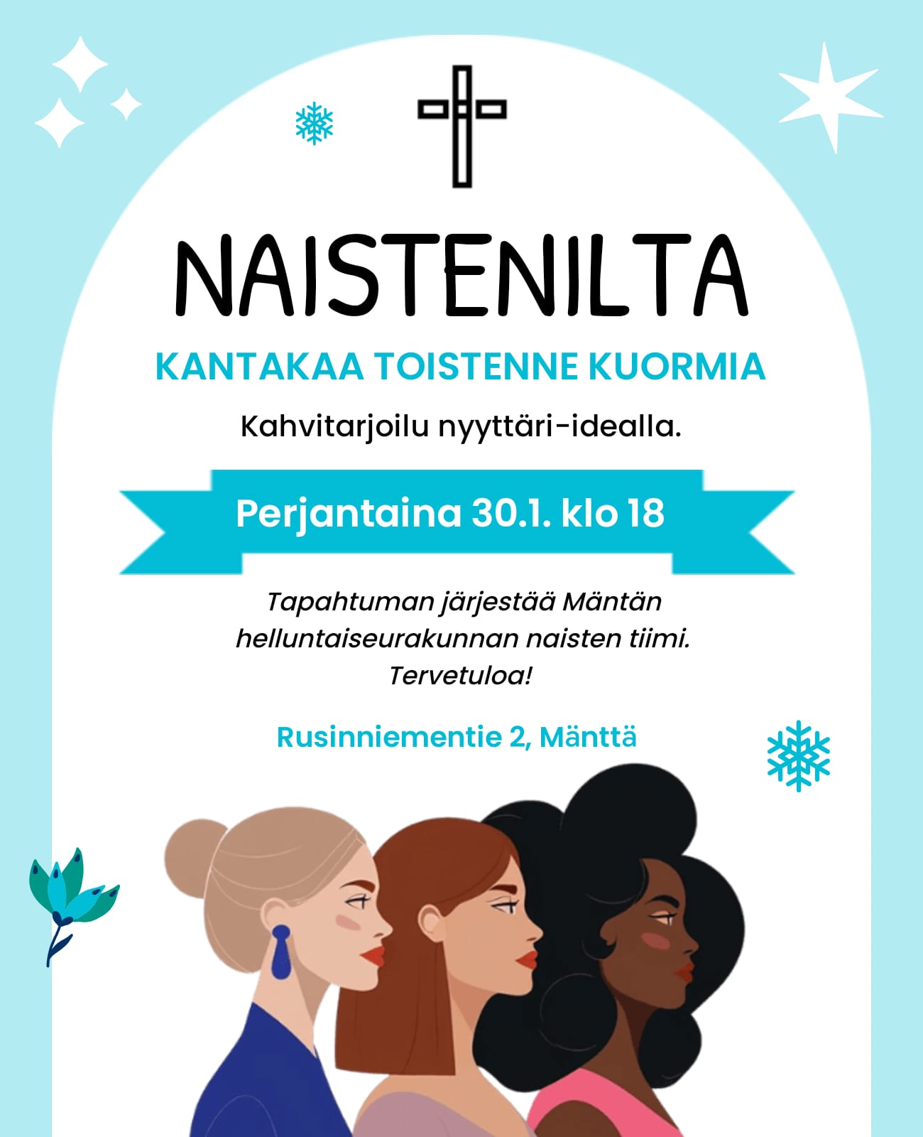 Naistenilta 30.1. 19.1.2026 Mäntän Helluntaiseurakunta Ajankohtaista Naisten ilta Mäntän helluntaiseurakunnassa perjantaina 30.1. klo 18. Kahvitarjoilu nyyttäri-idealla. Vapaa pääsy!