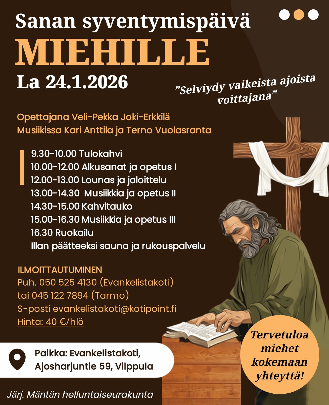 Sanan syventymispäivä miehille 24.1. 10.1.2026 Mäntän Helluntaiseurakunta Ajankohtaista Sanan syventymispäivä miehille lauantaina 24.1.2026 Evankelistakodilla Vilppulassa. Opettajana Veli-Pekka Joki-Erkkilä. Musiikissa Kari Anttila ja Terno Vuolasranta. Hinta 40 euroa. Tervetuloa miehet kokemaan yhteyttä!