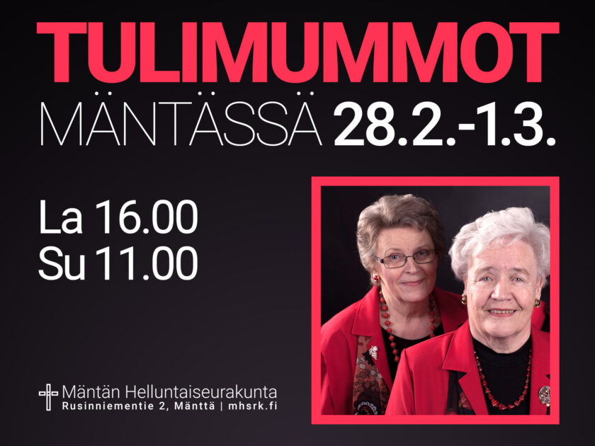 Tulimummot 28.2.-1.3. 22.2.2026 Mäntän Helluntaiseurakunta Ajankohtaista Tulimmummot Mirja Vehosmaa ja Auli Erkkilä Mäntässä launantaina 28.2. klo 16 ja sunnuntaina 1.3. klo 11. Musiikissa lauluryhmä Tulisisaret. Sunnuntain jumalanpalveluksessa myös ehtoollinen, pyhäkoulu ja lounas. Tervetuloa mukaan!