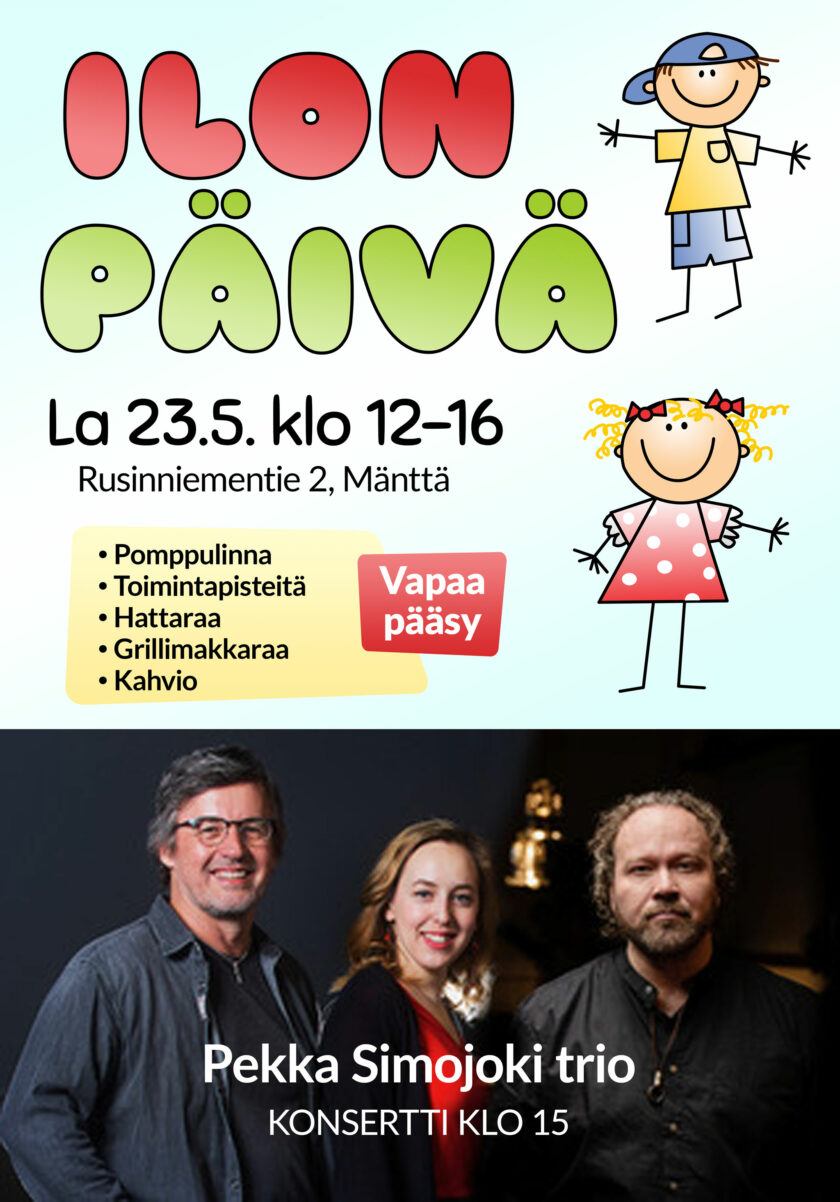 Ilon päivä 23.5. 19.4.2026 Mäntän Helluntaiseurakunta Ajankohtaista Tulossa koko perheelle suunnattu tapahtuma 23. toukokuuta. Tapahtumassa esiintyy Pekka Simojoki trio. Lisätietoja tapahtumasta myöhemmin.